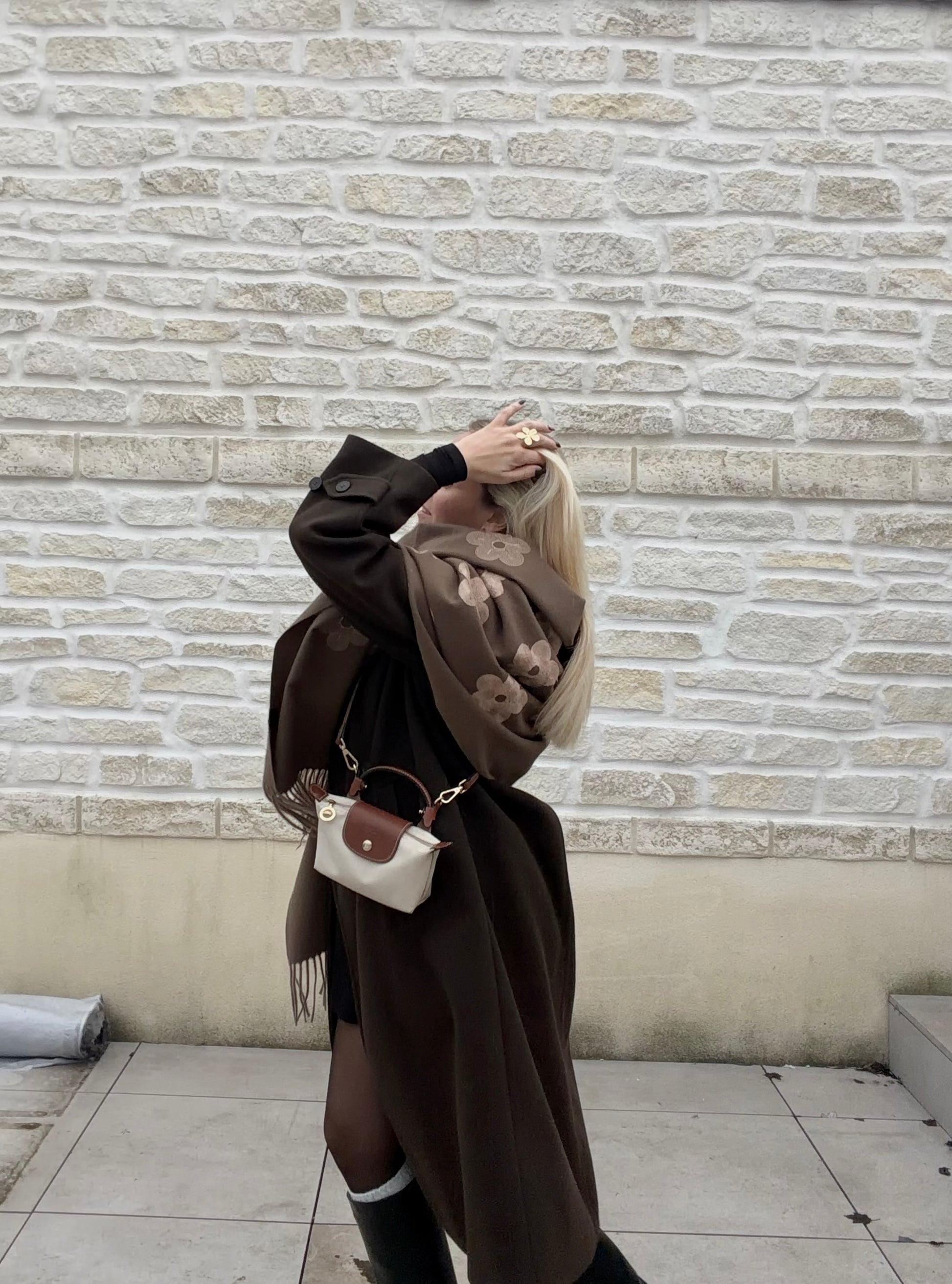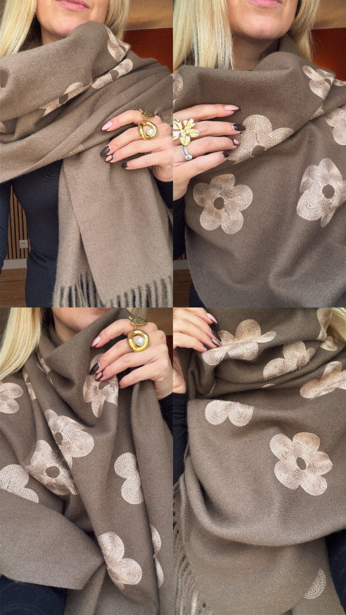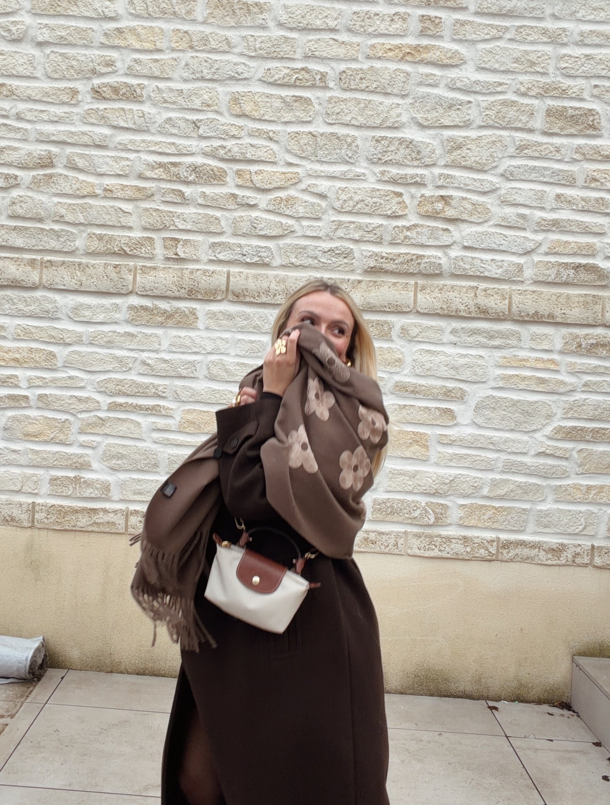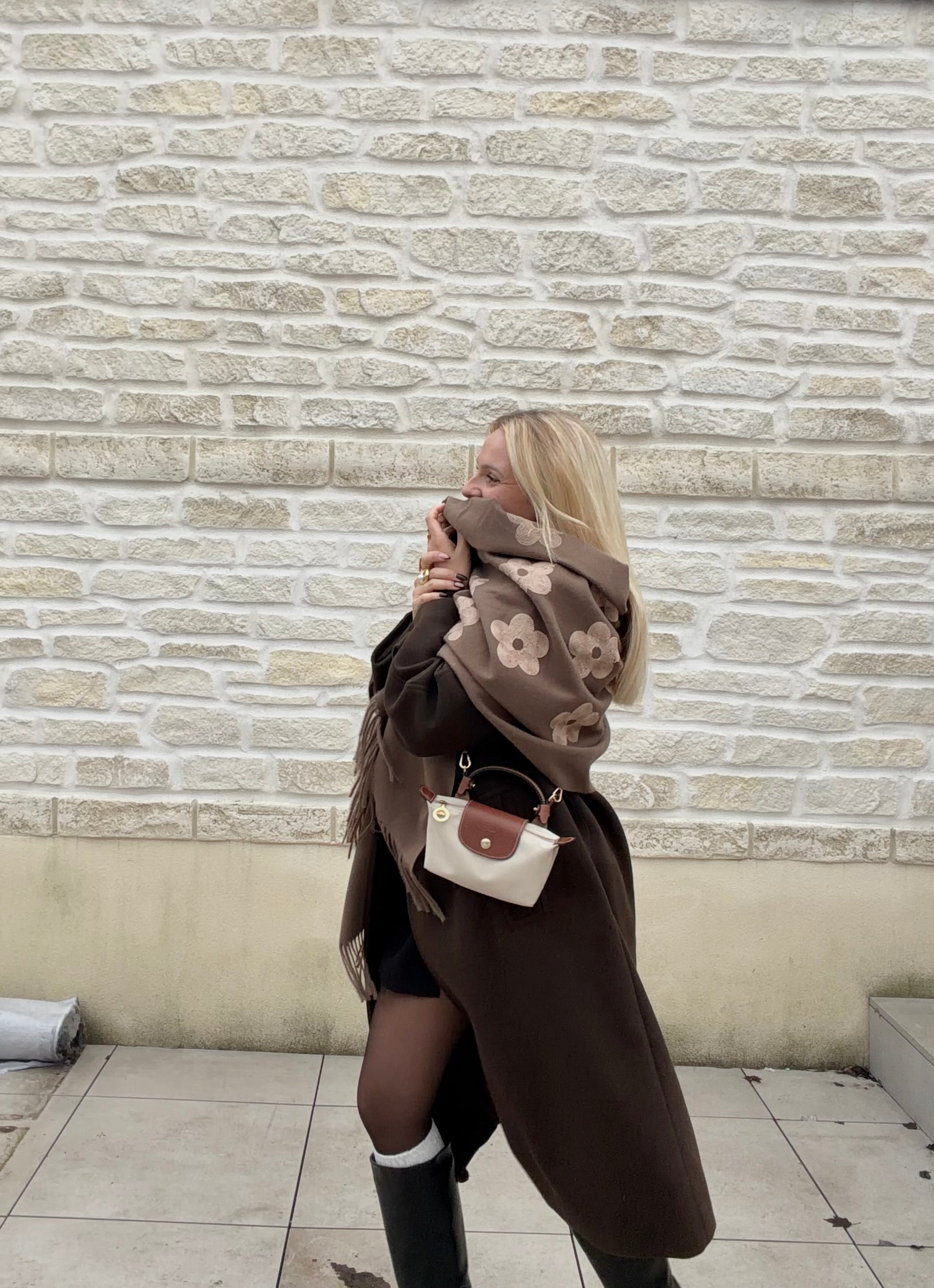Écharpe en laine fleurie marron, douce et chaleureuse, idéale pour affronter l’hiver. 30% laine / 70% viscose